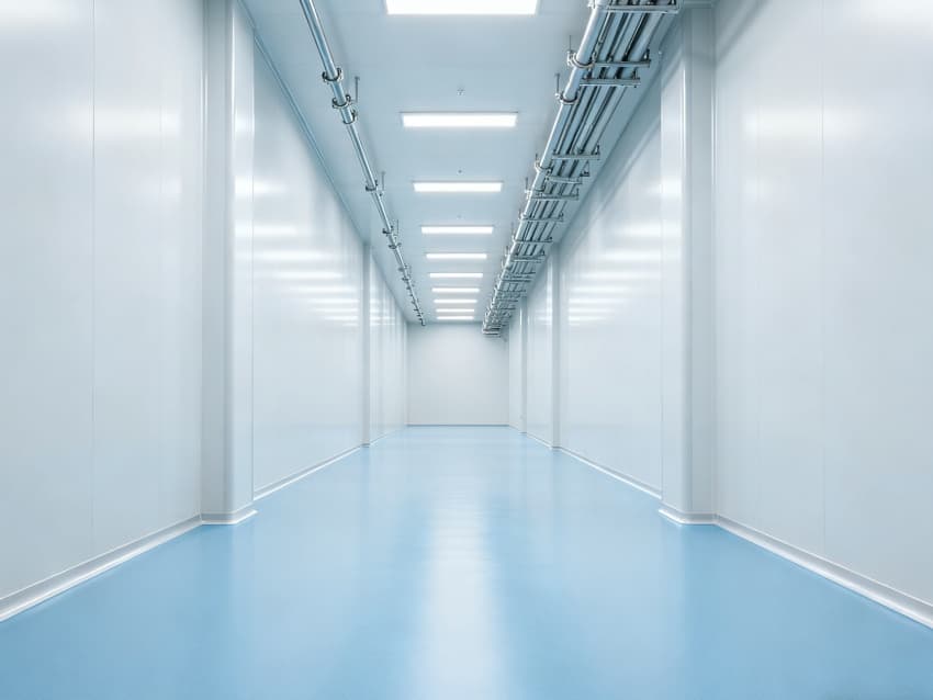 內部按功能劃分為六大潔凈區域:核心潔凈生產區(淺藍色防滑防霉地面)預留開闊空間,滿足發酵罐、純化設備等后期安裝;頂部潔凈送風區通過規整風閥系統,實現萬級潔凈度均勻送風;墻面過渡區采用圓弧轉角設計,避免粉塵堆積;密閉觀察區設雙層鋼化觀察窗,兼顧生產監控與無菌隔離;縱向設備預留區保留8米凈高,適配大型凍干設備動線;輔助緩沖區銜接車間入口,搭配風淋系統,實現人員/物料潔凈過渡。整體空曠布局既保障潔凈操作空間,又滿足皖北生物制藥企業靈活擴產需求,為本地藥企提供合規、高效的生產載體。