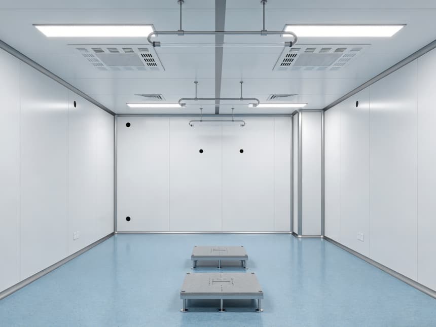 電子光學(xué)車間內(nèi)部細(xì)節(jié)設(shè)計精準(zhǔn)匹配行業(yè)核心需求,整體采用淺藍(lán)色防靜電潔凈地坪與白色無縫潔凈墻面的組合,風(fēng)格簡約統(tǒng)一。地面選用3mm厚環(huán)氧防靜電材質(zhì),表面經(jīng)啞光工藝處理,既能有效規(guī)避強(qiáng)光反射對光學(xué)檢測造成的干擾,又具備10?-10?Ω的穩(wěn)定防靜電性能;同時兼具優(yōu)異的耐磨特性,可耐受酒精等常用清潔劑擦拭,墻角均采用50mm圓弧設(shè)計,從根源上消除積塵死角,筑牢潔凈基礎(chǔ)。