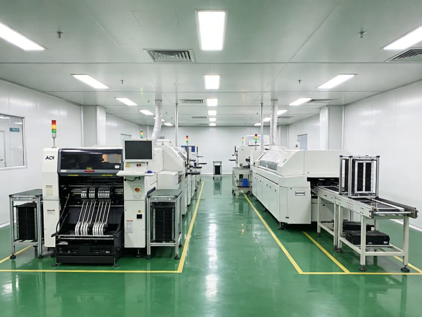 SMT 核心生產(chǎn)區(qū):針對(duì)高速貼片機(jī)、回流焊等設(shè)備做了地面承重加固與管線預(yù)埋,配置伸縮式通風(fēng)除塵管道,及時(shí)收集焊煙與粉塵;防靜電工作臺(tái)搭配 LED 工位燈,保障貼片、焊接的精度與效率。