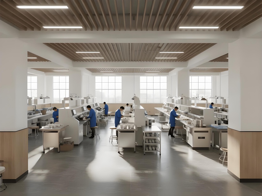 本餐具制品車間設計以現代簡約工業風為核心,融合高效生產與視覺舒適性。色調以純凈白(墻面)、淺木色(倉儲柜)和不銹鋼銀灰(設備)為主,營造清爽專業的氛圍。