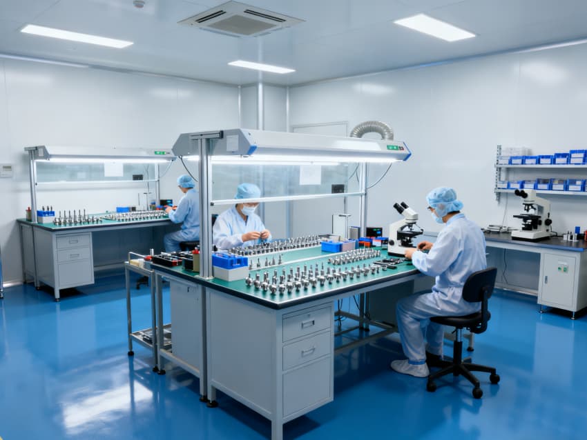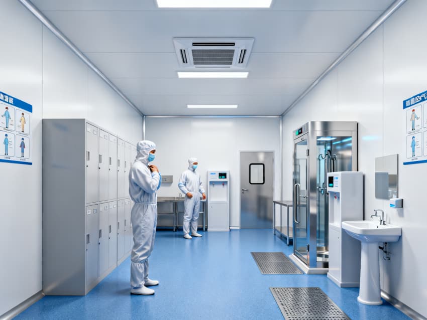 凈化配套設計全面:藍色地面具備抗菌、易消殺特性,配合地面導坡設計加速清潔排水,減少污漬殘留;白色墻面采用無縫抗菌涂層,消除清潔死角,降低微生物附著風險;全車間劃分獨立凈化分區(qū),通過壓差控制預留設計隔絕不同潔凈等級區(qū)域,人流、物流通道分離避免交叉污染,全方位保障無菌生產(chǎn)環(huán)境穩(wěn)定達標。