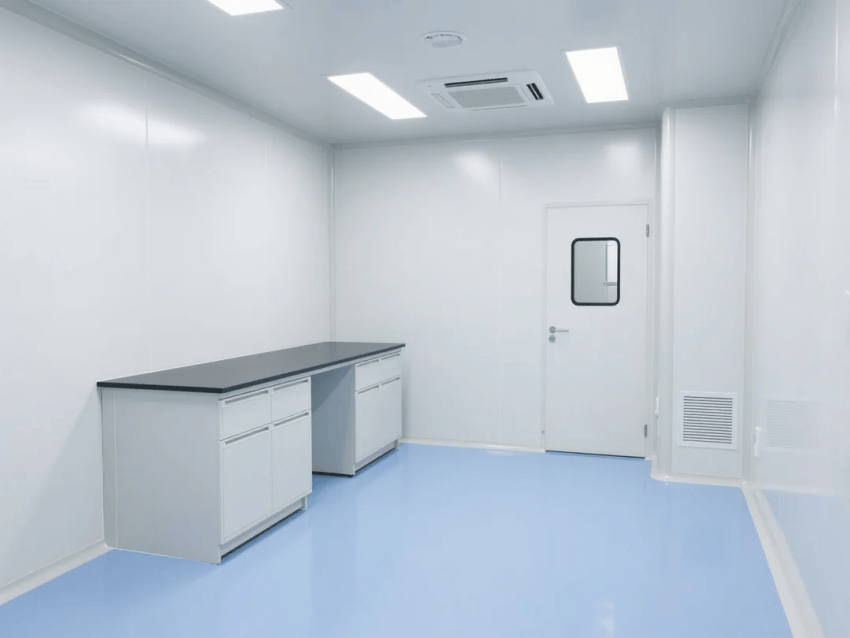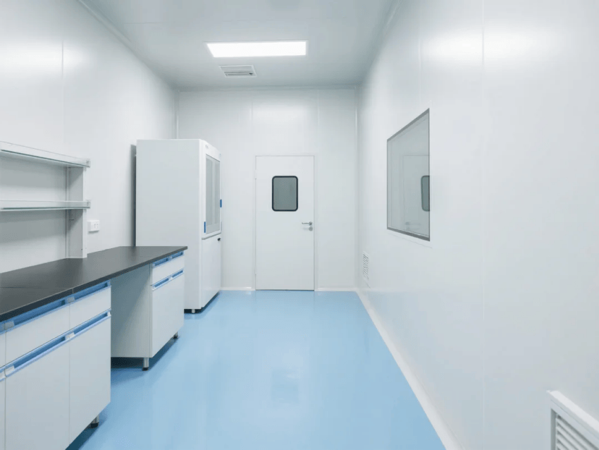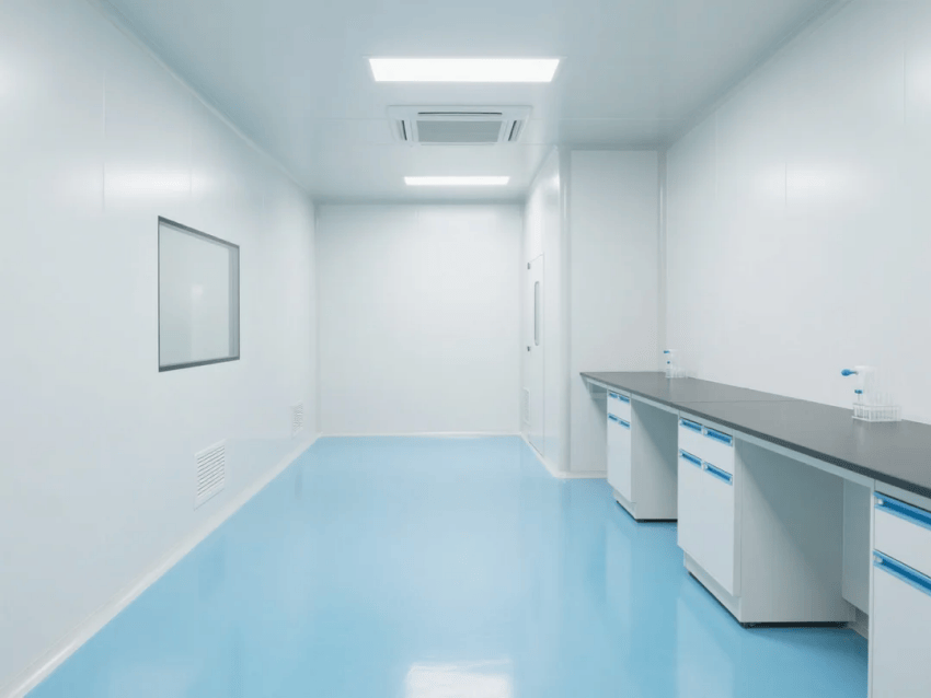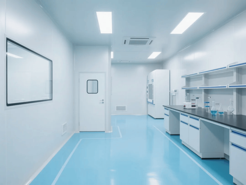 本方案采用生物科技極簡風(fēng)格,嚴(yán)格遵循ISO14644-1Class6潔凈標(biāo)準(zhǔn)。空間以純白抗菌彩鋼板墻體與淺藍環(huán)氧樹脂地坪構(gòu)建主體框架,營造純凈、高效的檢測環(huán)境。墻體采用50mm厚醫(yī)療級抗菌彩鋼板,所有接縫處采用R30mm圓弧處理工藝,確保無衛(wèi)生死角。淺藍環(huán)氧地坪添加防滑顆粒,摩擦系數(shù)≥0.6,同時具備優(yōu)異的耐化性。