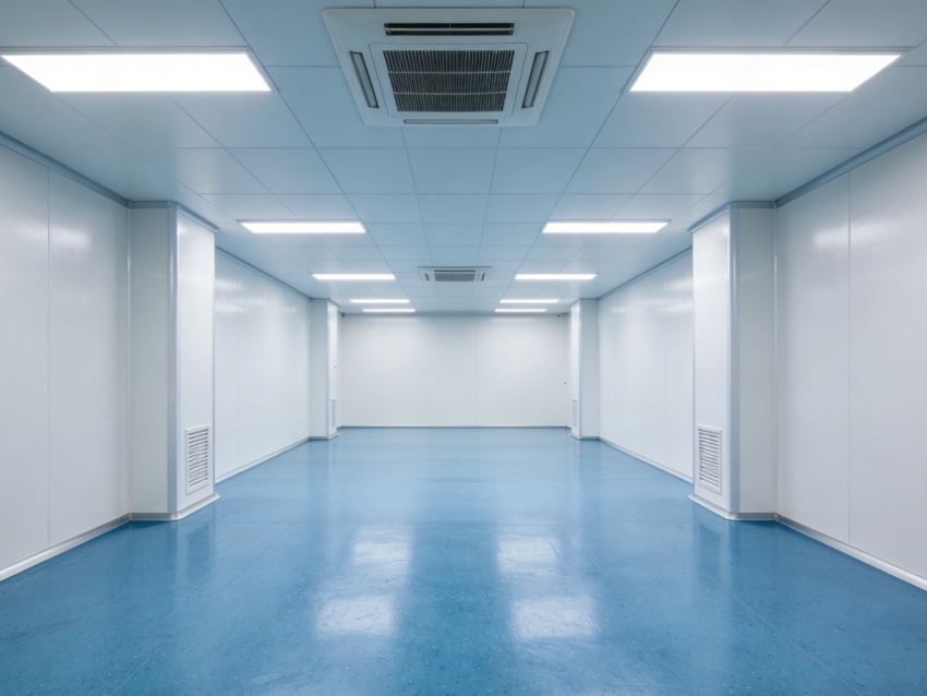 本次呈現的廠房電子光學車間,整體風格簡約專業,精準匹配電子光學器件研發與生產的核心需求。廠房外立面采用淺灰色工業基材搭配大面積高透玻璃幕墻,既保障建筑密封性與隔音性,又為內部車間引入充足自然光,外觀簡潔大氣且兼具工業質感與科技感。均以藍色防靜電潔凈地坪搭配白色無縫潔凈墻面。藍色地面選用高耐磨環氧材質,具備10?-10?Ω防靜電性能,可有效規避靜電對光學元件的損害,表面啞光處理減少光線反射;白色墻面采用環保抗菌涂層,無縫拼接設計消除清潔死角,搭配嵌入式防眩光照明,營造穩定的視覺環境。