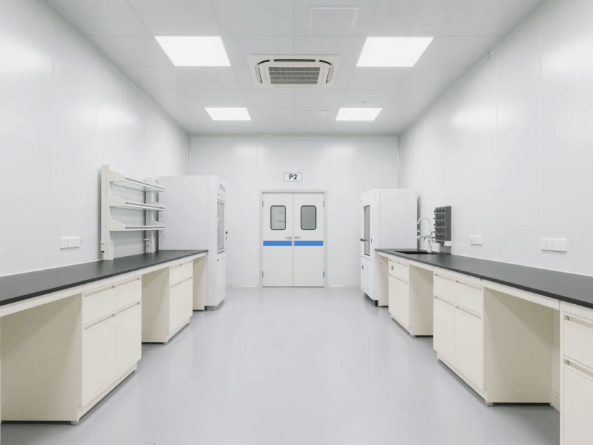 本實驗室嚴格遵循《生物安全實驗室建筑技術規范》GB50346標準,以"科技純凈"為設計理念,通過象牙白彩鋼板墻體與淺灰環氧樹脂地坪的極簡組合,打造符合P2防護要求的現代化研發空間。