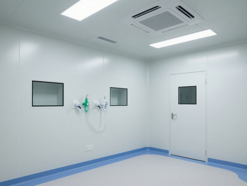 醫療潔凈室,層流凈化系統頂部排列,墻面使用醫用抗菌彩鋼板,地面采用2mm同質透心PVC卷材。手術區配置無影燈和數字化麻醉機,自動感應氣密門帶電子壓差顯示。醫護