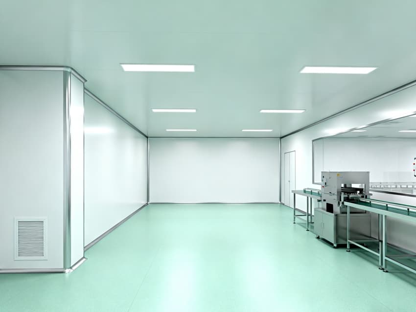 內部生產車間以淺綠色防滑防污地面、白色抗菌墻壁為基礎,按不同視角呈現功能分區:正面視角為核心生產區,預留8米柱距,適配注塑機、精密組裝設備;側面視角為無菌操作預留區,可快速升級至萬級潔凈標準,滿足植入類器械生產;背面視角為物料凈化區,設雙層傳遞窗,避免原料污染;左右側視角分別為質檢區與包裝區,前者預留檢測儀器平臺,后者規劃自動化包裝動線;45度角視角展現人員潔凈通道,含風淋室、更衣間,嚴格控制人員帶入污染物。整體空曠布局兼顧設備靈活擺放與合規要求,為醫療器械生產提供安全、高效的專業化空間。